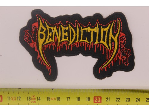 SHAPED EMBROIDERED PATCH BENEDICTION - YELLOW/RED NAME LOGO